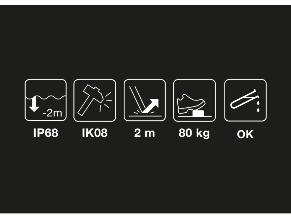 - Odolná svítilna je nárazuvzdorná (IK08), odolná proti pádu (až ze 2 metrů) a odolná proti rozdrcení (až do 80 kg).