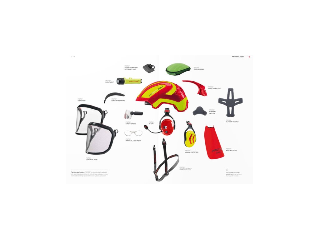 Základní přilbu Protos Integral je možné doplnit o bohaté příslušenství: chrániče sluchu, obličejový štít, vložka pro absorbci nárazu, podbradní pásek pro práce ve výškách, komunikační set, integrované brýle, pracovní LED svítilny a ochranu krku.