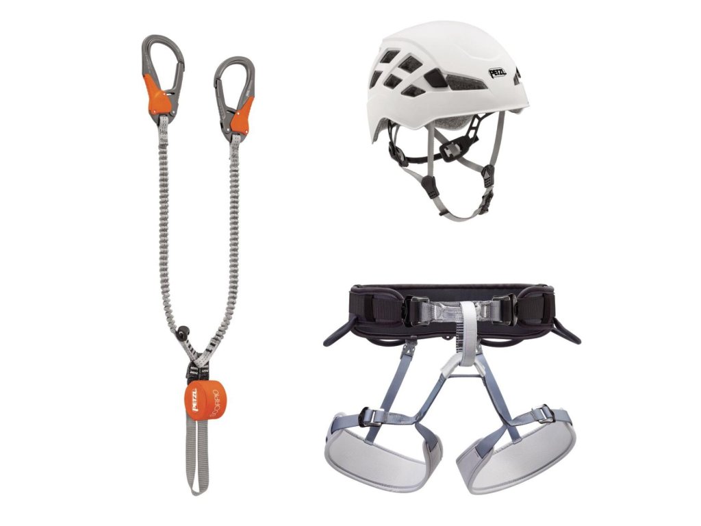 Petzl - Kit Via Ferrata Eashook ve dvou velikostech. Set obsahuje ferratový tlumič Scorpio Eashook, univerzální nastavitelný horolezecký sedací úvazek Corax a přilbu Boreo.